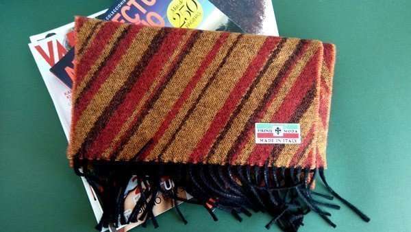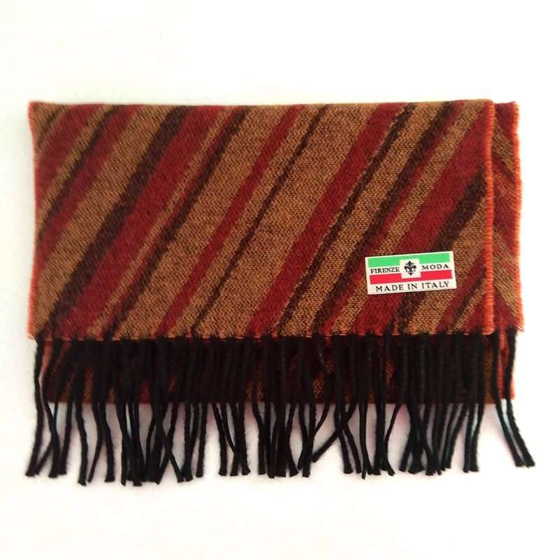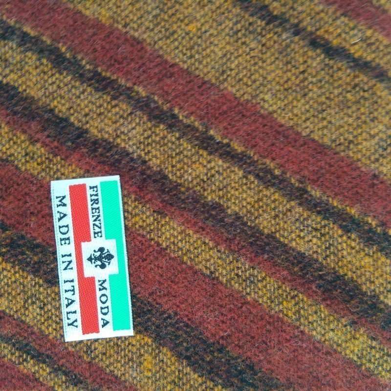 La bufanda Firenze en lana está adornada con lineas rojas y negras sobre un fondo color ocre y flecos negros. Es un accesorio perfecto para personalizar tus looks con un toque de elegancia durante la estación más fría.