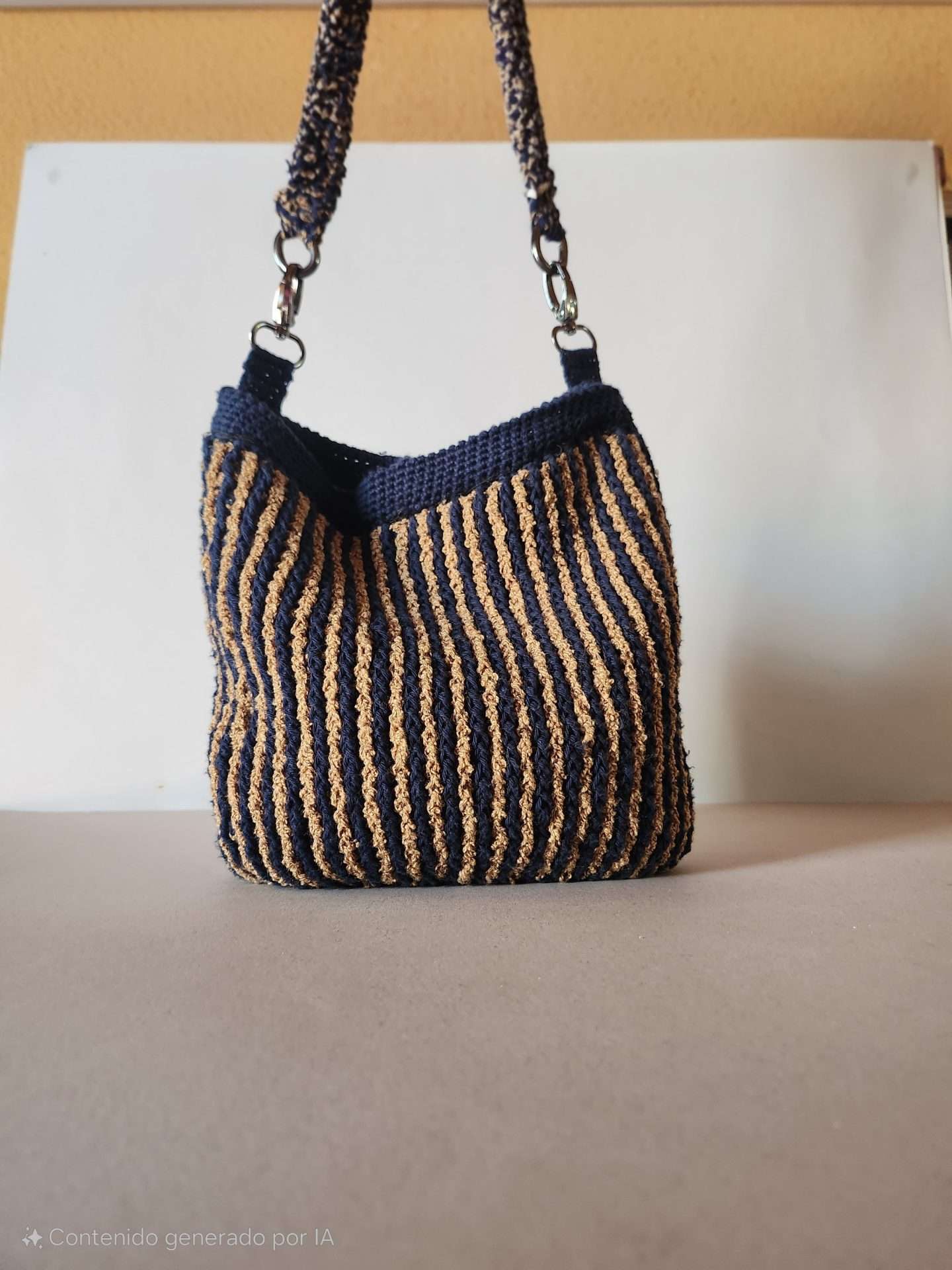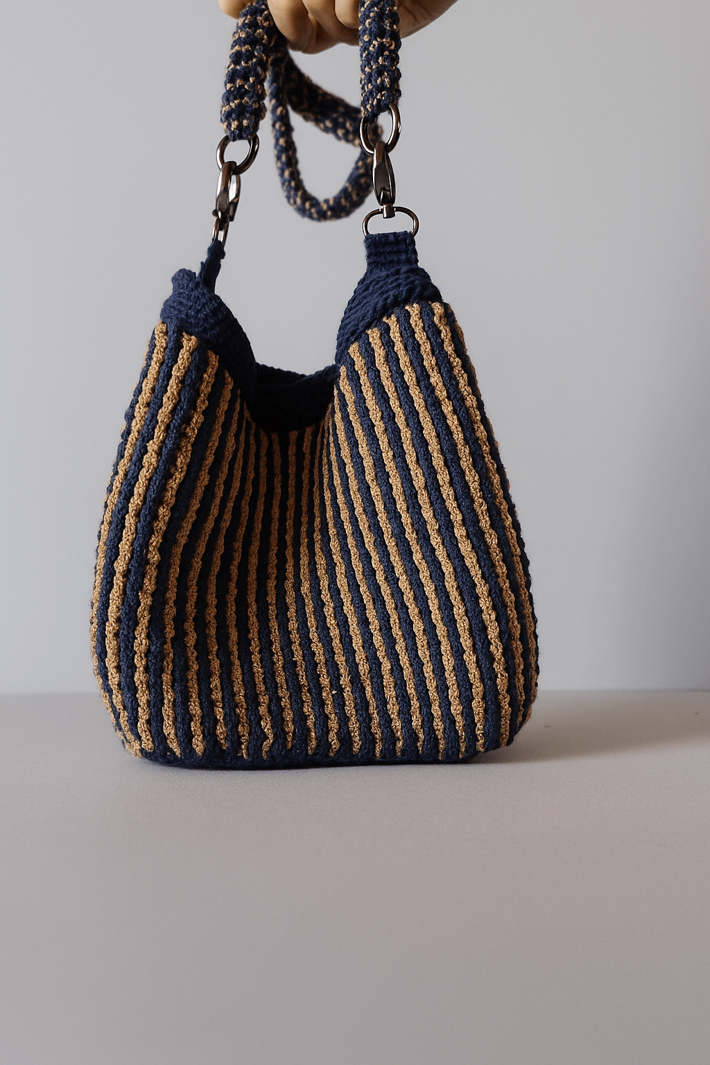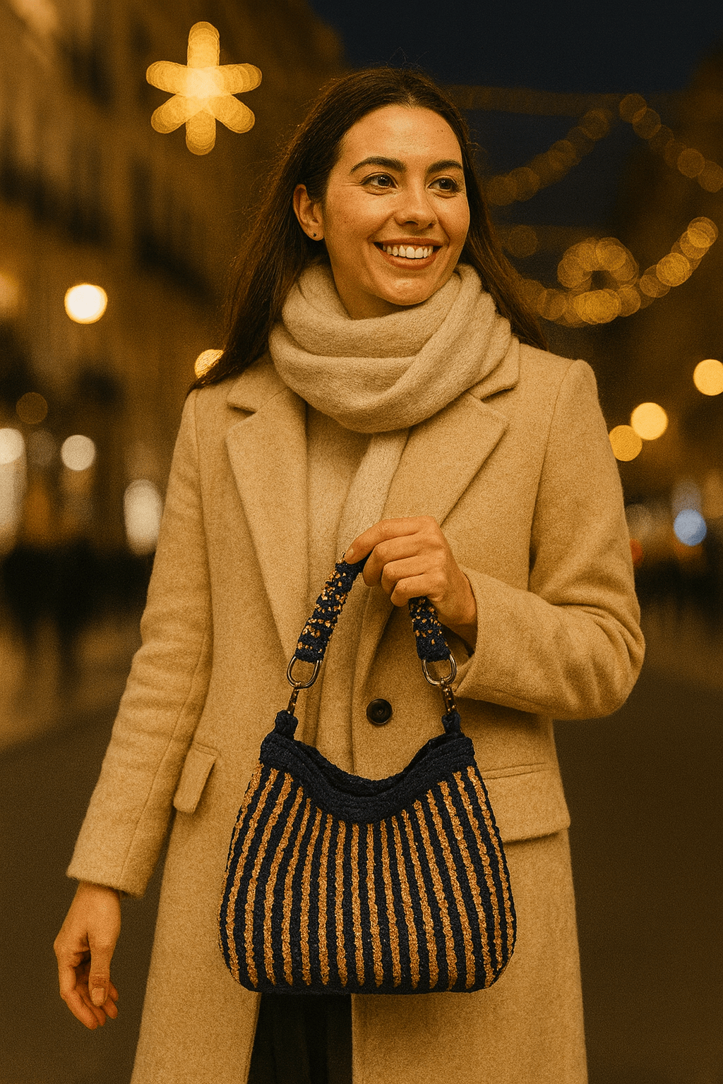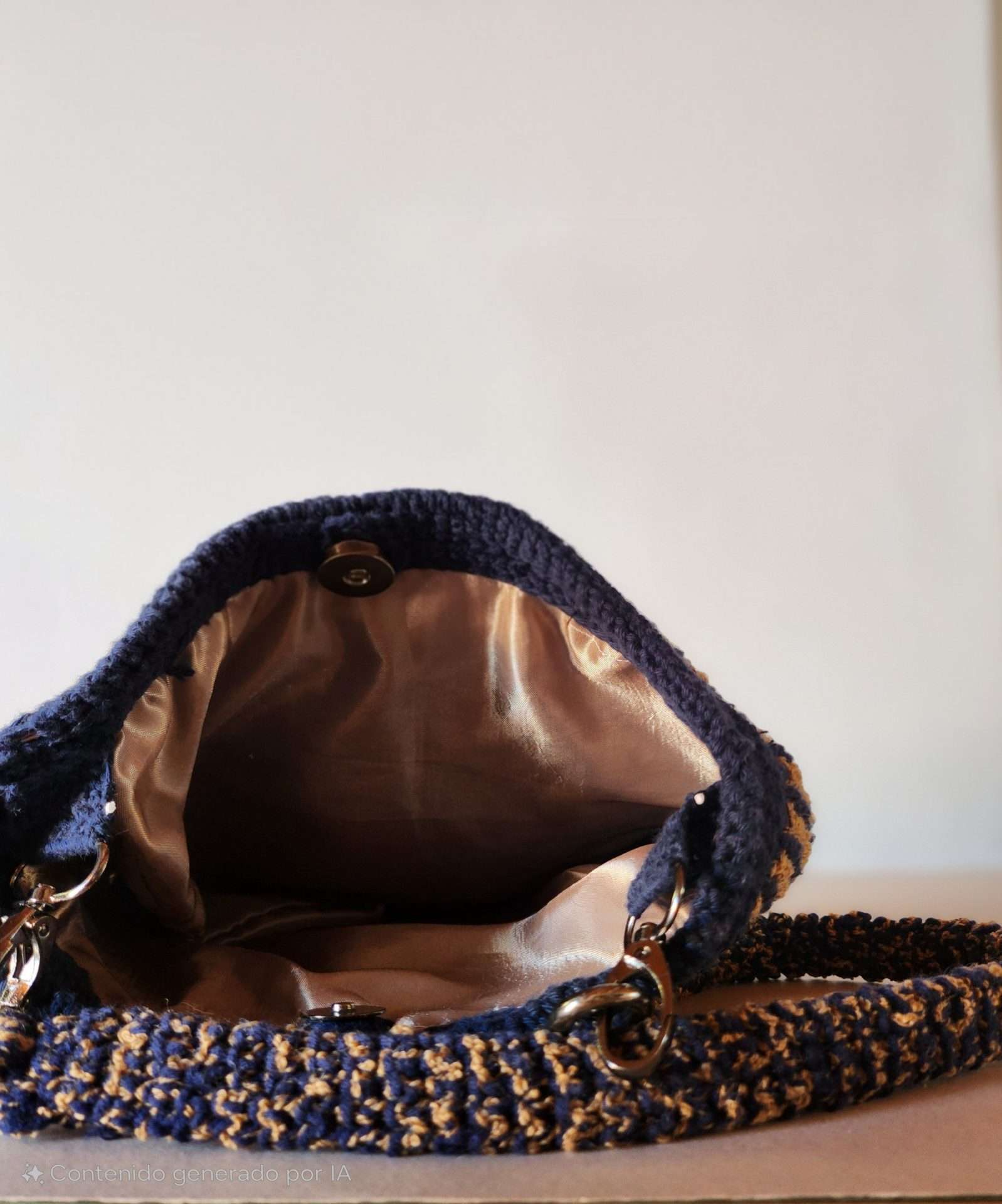 Bolso delicado y minimalista en tejido fino. Incluye asa larga de 60 cm y asa corta doble. Forro interior y cierre magnético. Decorado con charms.
